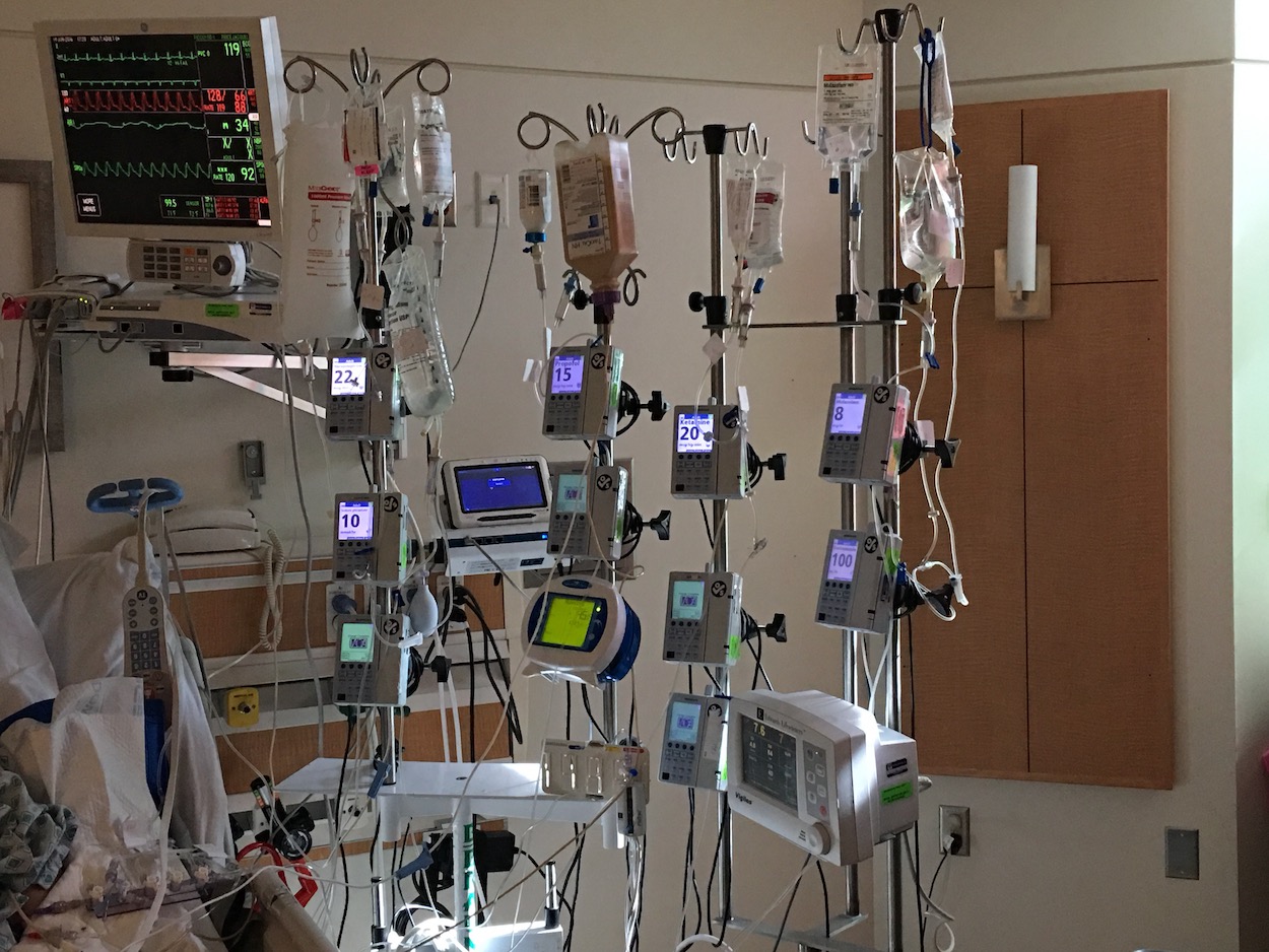 Jackie was living her life as twenty-somethings do. She had a job in the finance department of the business office of Lidl, a German grocery store come to America. She was living with her college roommate in a mixed-use urban community, hanging out with friends, spending time with family. Her energy level was down and she needed yet another sinus surgery. Jackie went from being uncomfortable to being wisped away to the ICU, once again at Fairfax Hospital, at this point on precautionary. Her heart rate was up. As Jackie's mother, I felt a sense of dread. So very little did I know. Jackie's status devolved into an all-night effort to save her, intubation meaning an external breathing machine and a medically induced coma, this level of intervention driven by a brilliant medical team.  They saved Jackie. It took months. The panel of intravenous interventions pictured here was just the start. A Chance Meeting with Life, Inside an Intensive Care Unit and Out.