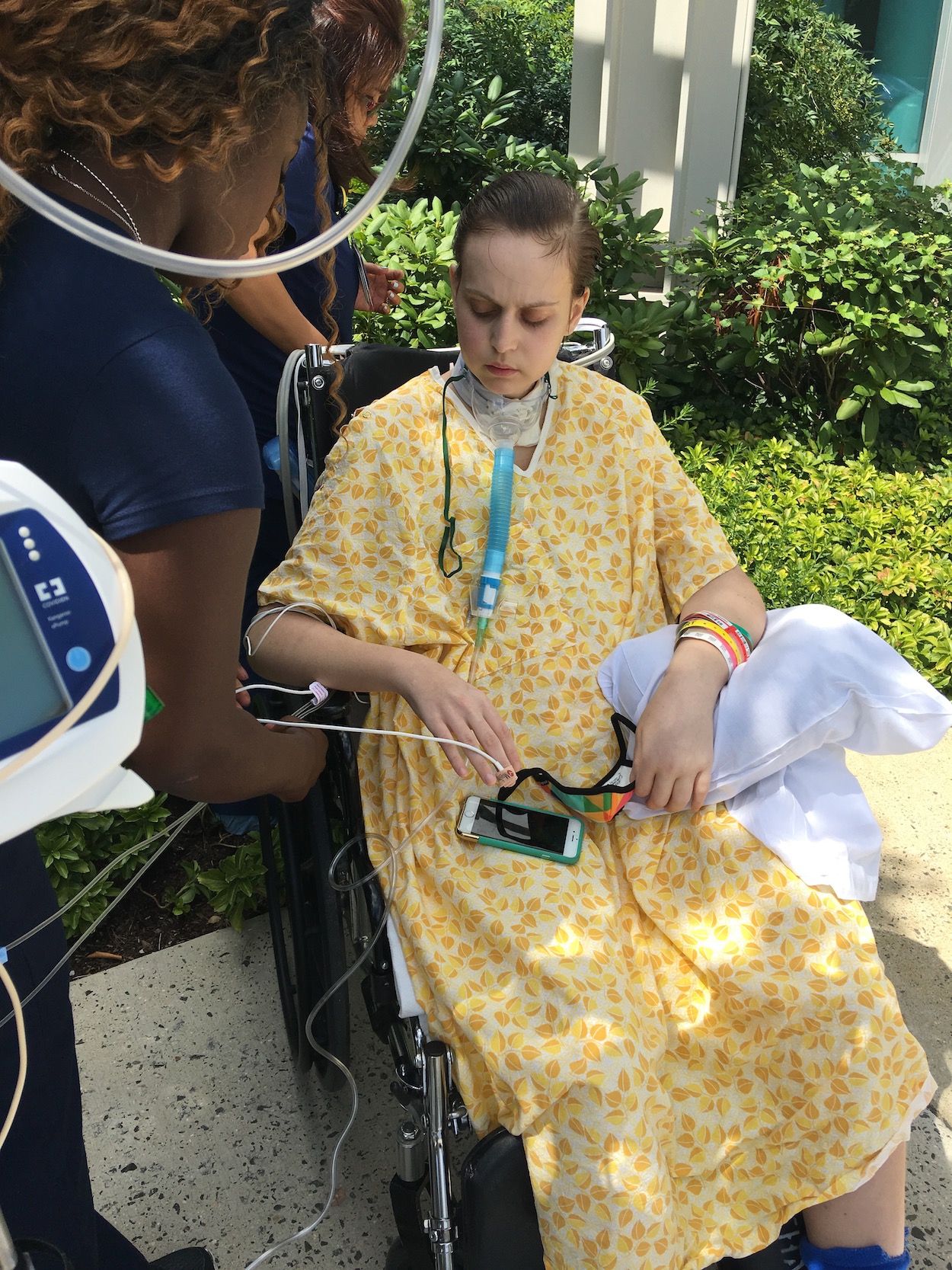 The week following Jackie's lung collapse, intubation on a ventilator and survival on ECMO (an external lung machine), Jackie underwent an emergency bilateral lung transplant. Her twelve hour transplant surgery was followed the next day by four hours of "going in" again and then laparoscopic surgery the week end to come to clear out a tide of fluid surrounding her chest cavity. Jackie did survive unaware for several weeks until weaning off of sedation without agitation became possible. The breathing tube was eventually replaced by a "trach." Jackie remained on a "trach," (the device at her neck) to breathe for her at some level while slowly weaning off as she and her new lungs grew stronger and eventually independent. Her brother traveled down to "D.C." from Boston to see his miracle-of-a-sister, finally alert and aware of what happened to her.